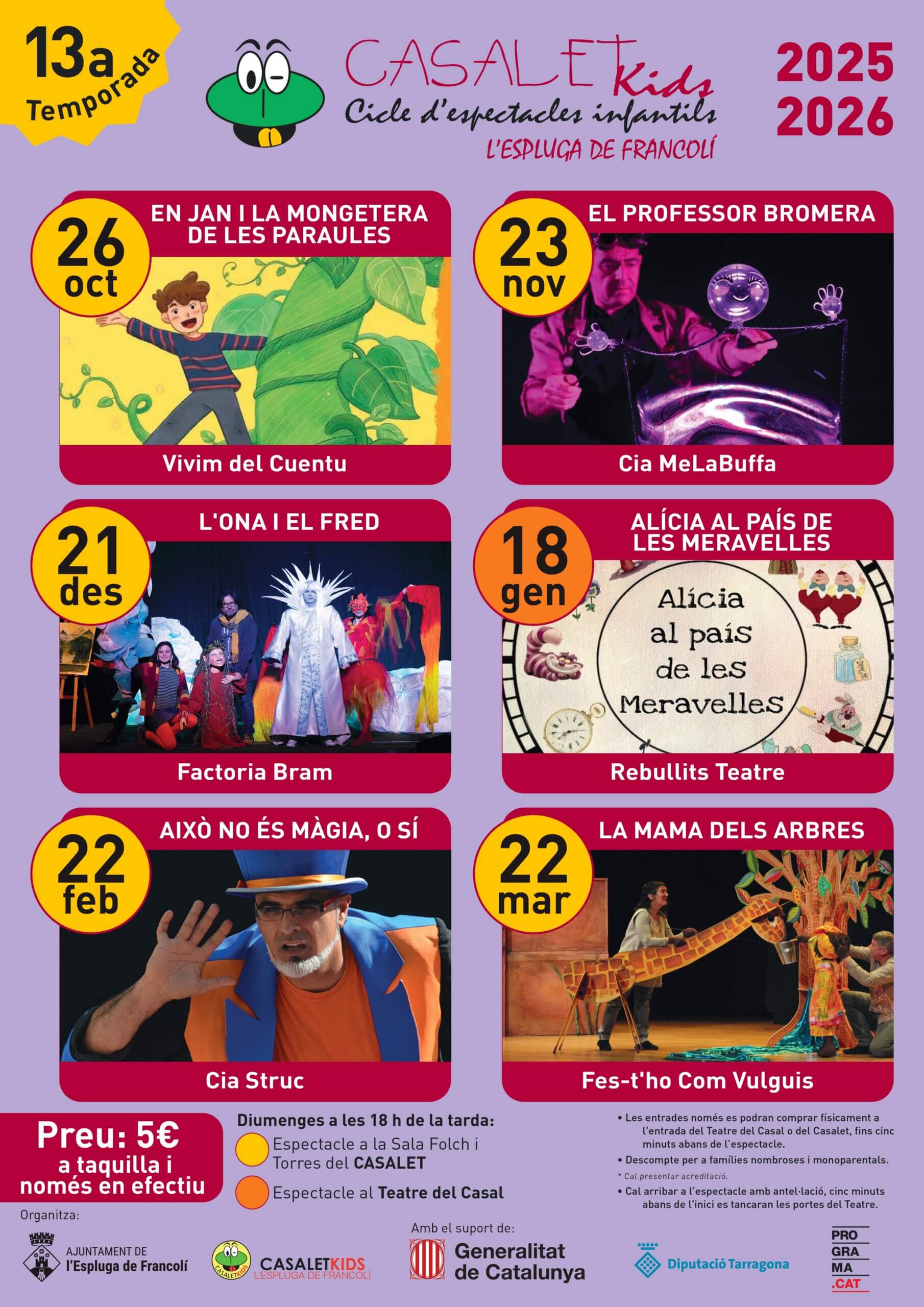 El cicle, consolidat com una de les propostes familiars més destacades de l’Espluga de Francolí, comptarà enguany amb sis espectacles que es duran a terme entre els mesos d’octubre i març de 2026, tots ells a les sis de la tarda. Les funcions tindran lloc majoritàriament a la sala Folch i Torres del Casalet, amb l’excepció de la representació de Alícia al país de les meravelles, que es farà al Teatre del Casal.